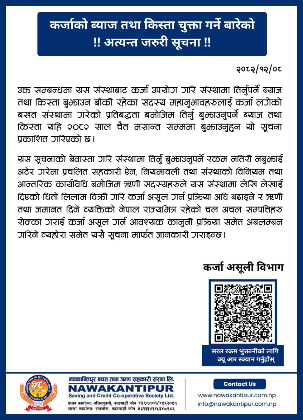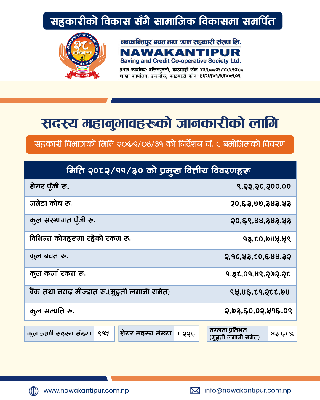 Respecting to the true spirit of Co-operative revolution of government of Nepal, Nawakantipur Saving and Credit Co-operative Society Ltd. is established under the Co-operative Act 2074, with the slogan “your satisfaction is our destination” in 7th Aswin, 2054 B.S. With due respect to the sprite of co-operative revolution of the government of Nepal, Nawakantipur Saving and Credit Co-operative Society Ltd. has been operating with number of financial opportunities to its needy members & society as a whole ignoring cheap assurance of the market since 7th Aswin, 2054 B.S.